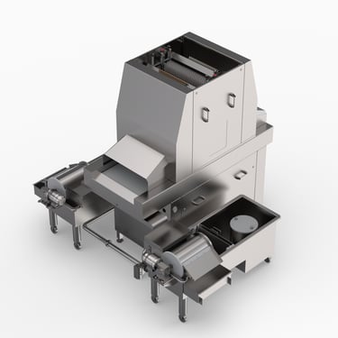 Equipamento robusto e automatizado, pode ser alimentado manualmente com cortes ou através de esteira transportadora;