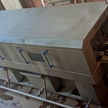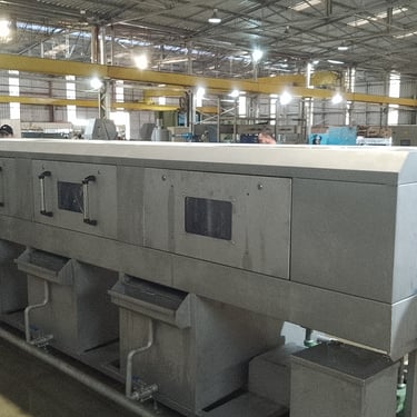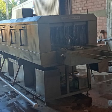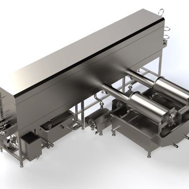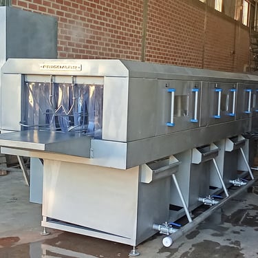 1º Estágio –Lavagem: Lavagem com água quente, aquecimento através da injeção direta de vapor ou resistências elétricas (confirmar com cliente); Motobomba com rotor em bronze e selo viton, trifásica 220/380V. Ramal duplo para lavagem; Tanque reservatório de água para recirculação; Reservatório para detritos e ladrão para o excesso de água; Possui um segmento com peneira filtrante para impedir que a bomba sugue sujeira e entupa os bicos; Dreno em tubo inox com espera para interligação no esgoto existente.